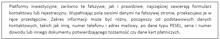 Przestępcy przy użyciu metod socjotechnicznych starają się nakłonić do inwestowania np. w kryptowaluty, nieruchomości, surowce, akcje, udziały, papiery wartościowe. Wszystko to opatrzone jest historią obiecującą duże zyski, które najczęściej nie wymagają praktycznie żadnego nakładu pracy i nie wiążą się z ryzykiem. Wystarczy uzupełnić formularz, wpłacić pieniądze na wskazaną platformę lub fundusz inwestycyjny… ale skąd masz pewność, czy za inwestycją nie stoją oszuści?