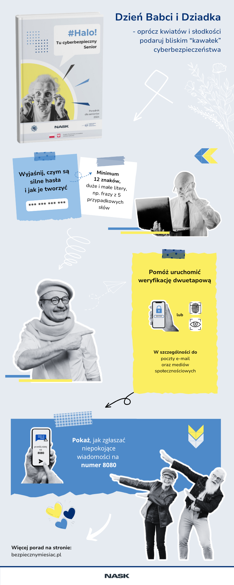Z pomocą przychodzi bezpłatny poradnik „Halo! Tu cyberbezpieczny Senior”, przygotowany wspólnie przez NASK – Państwowy Instytut Badawczy, Centralne Biuro Zwalczania Cyberprzestępczości oraz Warszawski Instytut Bankowości.