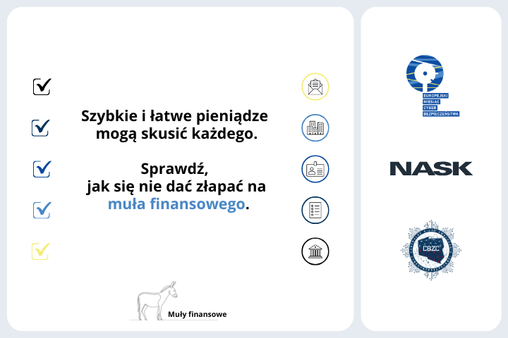 - Nie wykonuj transakcji bankowych, jeśli nie masz pewności czego dotyczą. Z pozoru proste, niewinne przelewy mogą nie tylko powodować stratę Twoich pieniędzy, ale nieść ze sobą poważne konsekwencje, takie jak udział w praniu pieniędzy.