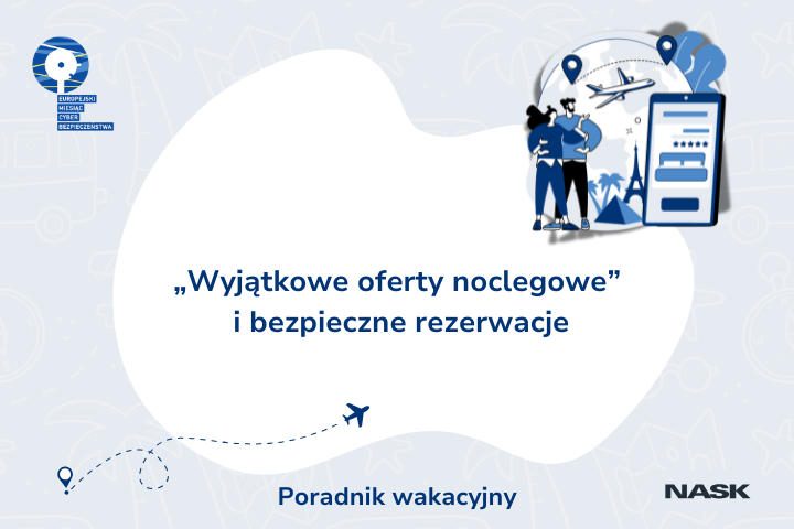 Wszelkiego rodzaju wyjazdy przeważnie wiążą się z wcześniejszą rezerwacją noclegów. Serwisy rezerwacyjne niejednokrotnie kuszą atrakcyjnymi ofertami, korzystniejszą ceną, możliwością zmiany lub nawet odwołania rezerwacji, a przede wszystkim możliwością przeglądania i porównywania ofert z wielu obiektów. Każdy znajdzie tam coś dla siebie! To wszystko dzięki popularnym aplikacjom lub stronom internetowym, na których możemy bardzo szybko znaleźć wymarzony nocleg w miejscu, które wcześniej wybraliśmy. Co zrobić, żeby korzystać z dostępnych na rynku stron i aplikacji? Wystarczy, że założysz konto, wprowadzisz swoje dane, wykupisz interesującą Cię ofertę i czekasz na dzień wyjazdu! Wszystko wydaje się proste. Wystarczy jednak chwila nieuwagi, pośpiech – najlepsze oferty momentalnie znikają! – a ucieknie Ci sprzed nosa wymarzony obiekt noclegowy. W takich momentach zapomina się o bezpieczeństwie, wyłącza czujność. Wiedzą o tym przestępcy, szukający sposobów na wyłudzenie danych i pieniędzy.